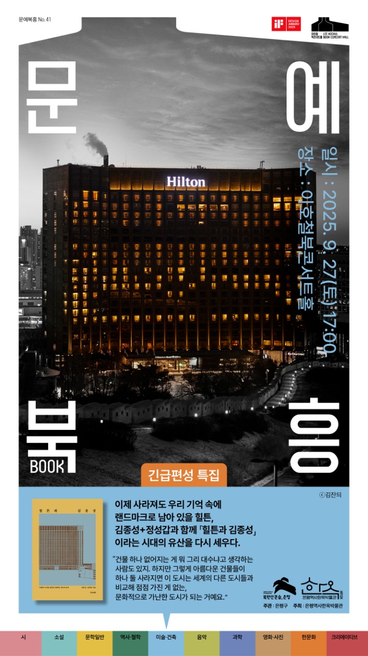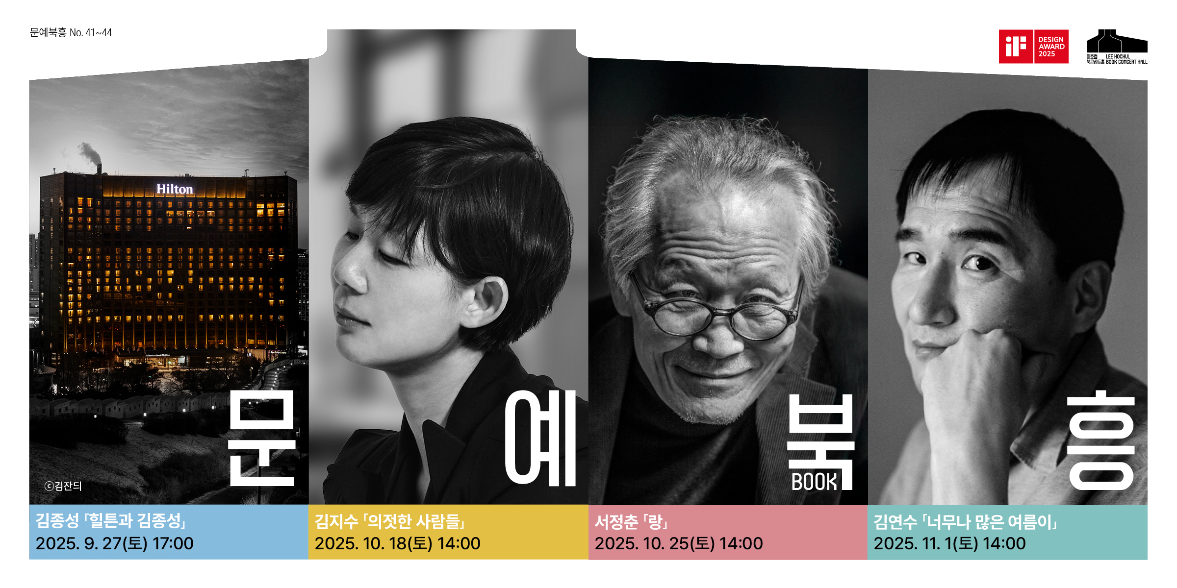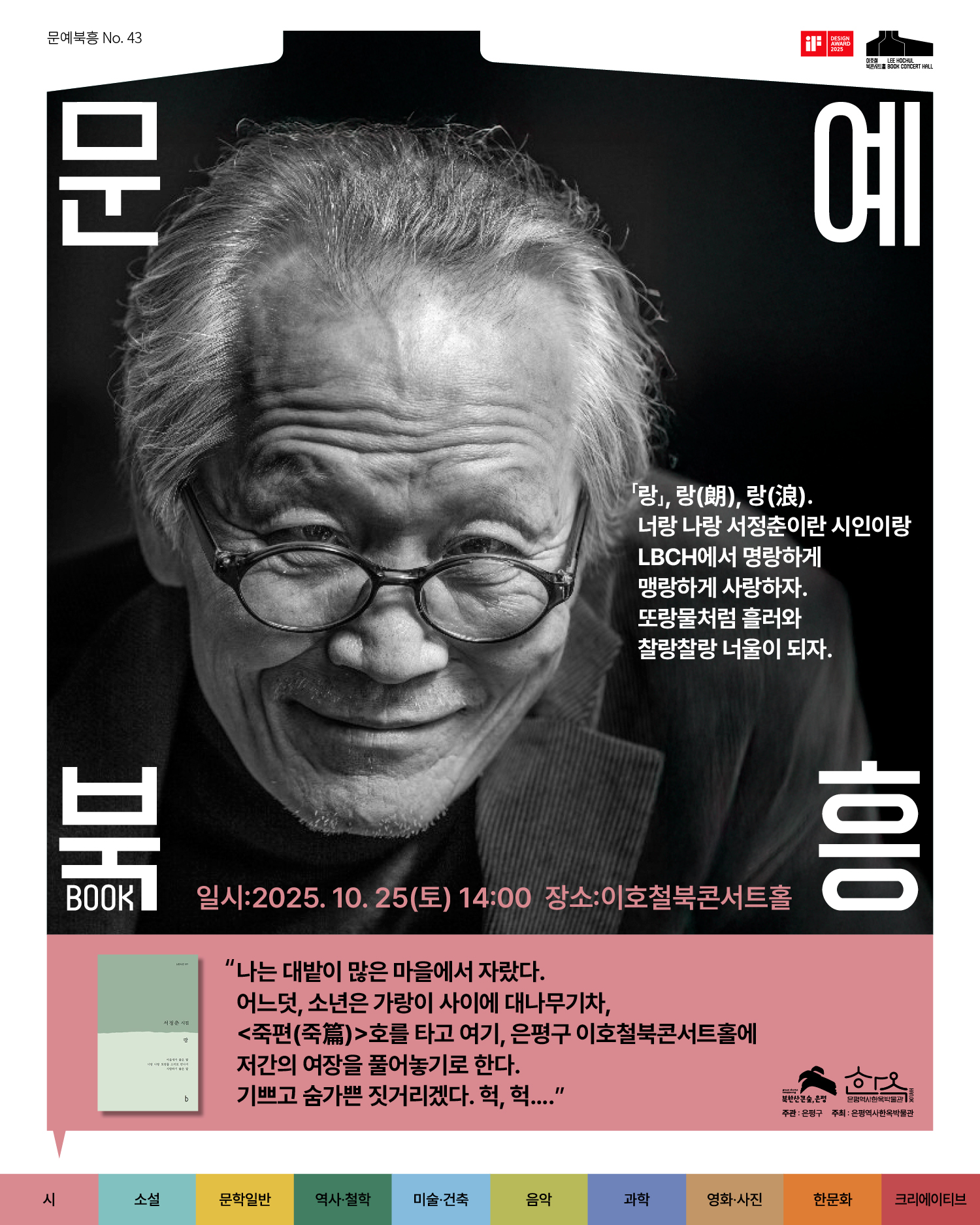 2025.09.23.은평의 문예부흥을 염원하는 문예북흥 프로그램을 2024년 11월부터 매주 토요일 52주간 운영합니다. ※ 9월 23일 부터 10월 전체 강연 신청가능 문예북흥 No.41 - 건축가 김종성, 작가 정성갑 이제 사라져도 우리 기억 속에 랜드마크로 남아 있을 힐튼, 김종성+정성갑과 함께「힐튼과 김종성」이라는 시대의 유산을 다시 세우다. 일시 : 2025.9.27.(토) 17:00 신청하기 문예북흥 No.42 - 작가 김지수 인터뷰어 김지수가 만난「의젓한 사람들」과 함께 우리 시대의 삶과 사유에 점잖고 묵직하게 다가가기. 일시 : 2025. 10. 18.(토) 14:00 신청하기 문예북흥 No.43 -시인 서정춘 「랑」, 랑(郞), 랑(浪). 너랑 나랑 서정춘이란 시인이랑 LBCH에서 명랑하게 맹랑하게 사랑하자. 또랑물처럼 흘러와 찰랑찰랑 너울이 되자. 일시 : 2025. 10. 25.(토) 14:00 신청하기 문예북흥 No.44 - 소설가 김연수 여름이 갔지만 여름으로 달려가자. 우리가 함께 살아갈「너무나 많은 여름이」잔잔하게 다정하게 다가올테니, 또 다시 여름이다. 김연수의 여름이다. 일시 : 2025. 11. 1.(토) 14:00 신청하기 ○ 장소 : 이호철북콘서트홀 (LBCH) 서울 은평구 통일로 767 호반베르디움스테이원 상가 2층 ○ 대상 : 누구나 (선착순 120명) ○ 참가비 : 5,000원 ○신청방법 : 이호철북콘서트홀 홈페이지 예약 / 현장신청
