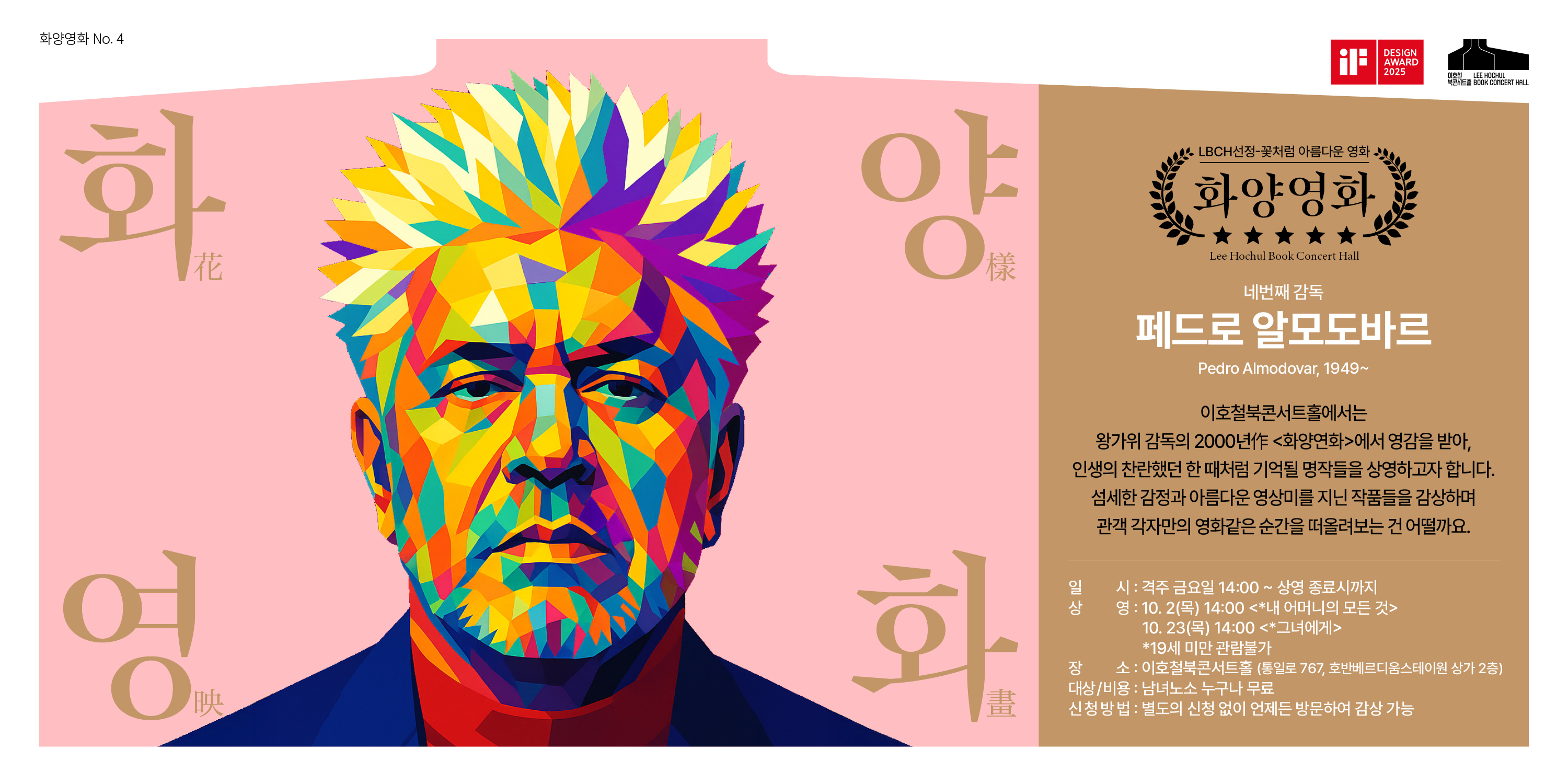 2025.10.11.안녕하세요. 화양영화 프로그램과 관련하여 상영 일정 변경을 안내드립니다. 당초 10.24.(금)으로 예정되어 있던 페드로 알모도바르 감독의 <그녀에게> 상영일이 행사 관련 대관 일정으로 인해 10.23.(목)으로 변경되었음을 알려드립니다. 관람 예정이신 분들께서는 일정 변경 사항을 확인하시어 관람에 착오 없으시길 바랍니다. 감사합니다.