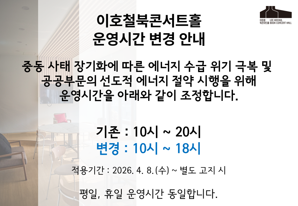 2025.12.31.은평의 문예부흥을 염원하는 문예북흥 프로그램을 2026년 1월부터 매월 둘째주, 넷째주 토요일에 운영합니다. 문예북흥 No.57 - 소설가 윤성희「느리게 가는 마음」 일시 : 2026. 3. 14.(토) 14:00 신청하기 문예북흥 No.58 - 작가 김중혁 「미묘한 메모의 묘미」 일시 : 2026. 3. 28.(토) 14:00 신청하기 문예북흥 No.59 - 작곡가 원일「들뢰즈, 괴물의 사유」 일시 : 2026. 4. 11.(토) 14:00 신청하기 문예북흥 No.60 - 음악평론가 이채훈「모차르트 평전」 일시 : 2026. 4. 25.(토) 14:00 신청하기 ○ 장소 : 이호철북콘서트홀 (LBCH) 서울 은평구 통일로 767 호반베르디움스테이원 상가 2층 ○ 대상 : 누구나 (선착순 120명) ○ 참가비 : 5,000원 ○신청방법 : 이호철북콘서트홀 홈페이지 예약 / 현장신청