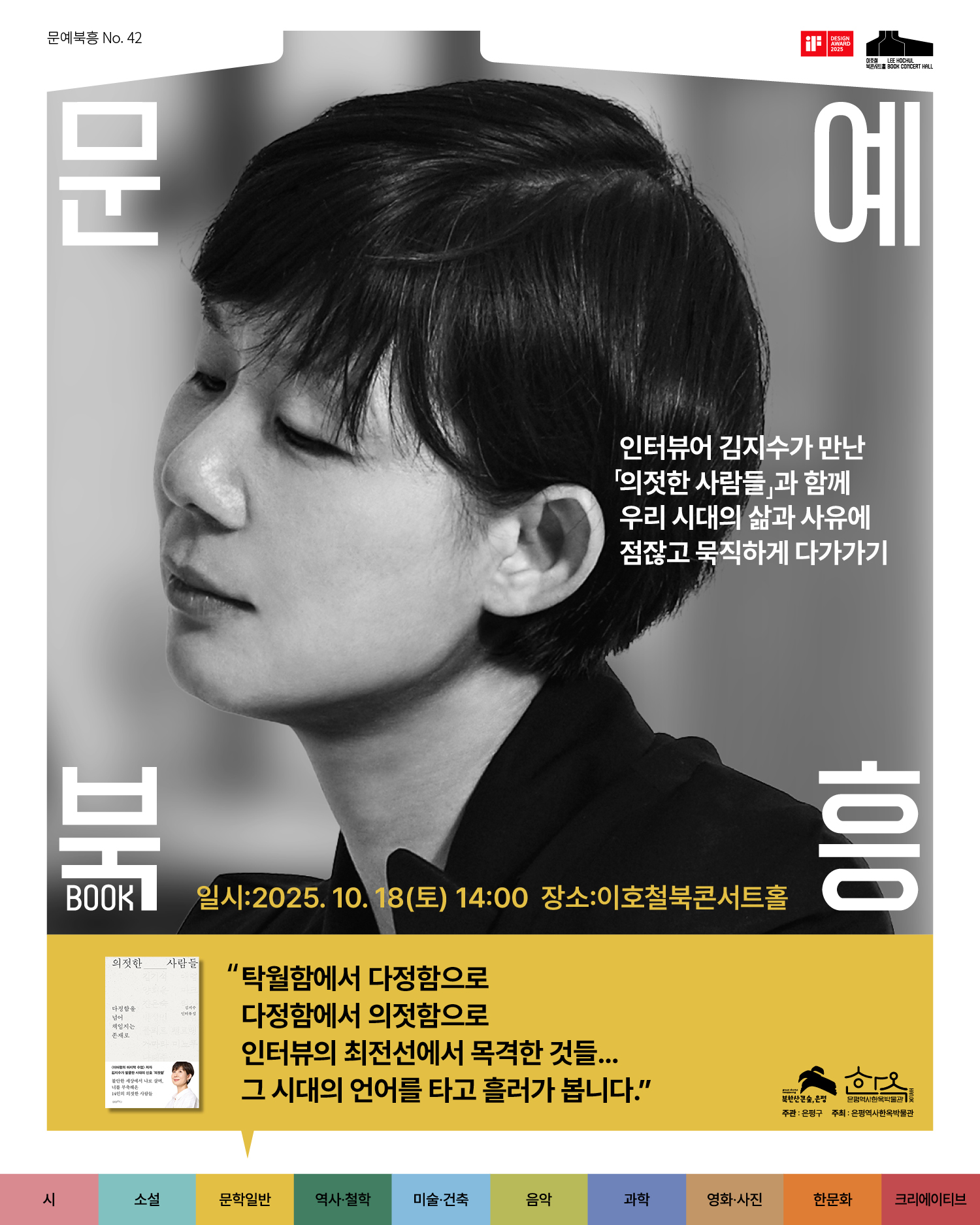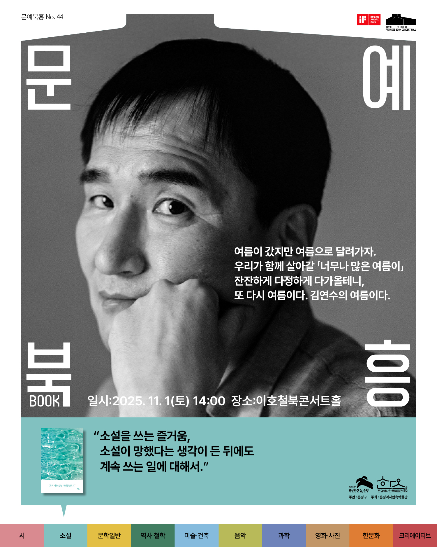 2025.08.16.은평의 문예부흥을 염원하는 문예북흥 프로그램을 2024년 11월부터 매주 토요일 52주간 운영합니다. ※ 8월 18일 부터 9월 전체 강연 신청가능 ?문예북흥 No.37 - 소설가 김숨 오감을 뛰어넘어「무지개 눈」으로 보는 세상, 김숨 작가와 함께 '듣는'무지개 같은 세상. 일시 : 2025.9.6.(토) 14:00 신청하기 ?문예북흥 No.38 - 시인 송경동 송경동 시인이 세상에 반복되는「사소한 물음들에 답함」, 잊히는 사람과 가치에 대해 「내일 다시 쓰겠습니다.」 일시 : 2025.9.13.(토) 14:00 신청하기 ?문예북흥 No.39 - 소설가 김종광 메타, 판타지, 풍자의 소설가 김종광이「소설가 소판돈의 낙서견문록」의 해학으로 우리 문학의 다양한 문제를 파헤친다.! 일시 : 2025.9.20.(토) 14:00 신청하기 ?문예북흥 No.40 - 소설가 심윤경 빛바랜 사진 한장으로 촉발된 심윤경의 호기심이 오랫동안 기억될「영원한 유산」으로 남게 되다. 일시 : 2025.9.27.(토) 14:00 신청하기 ○ 장소 : 이호철북콘서트홀 (LBCH) 서울 은평구 통일로 767 호반베르디움스테이원 상가 2층 ○ 대상 : 누구나 (선착순 120명) ○ 참가비 : 5,000원 ○신청방법 : 이호철북콘서트홀 홈페이지 예약 / 현장신청
