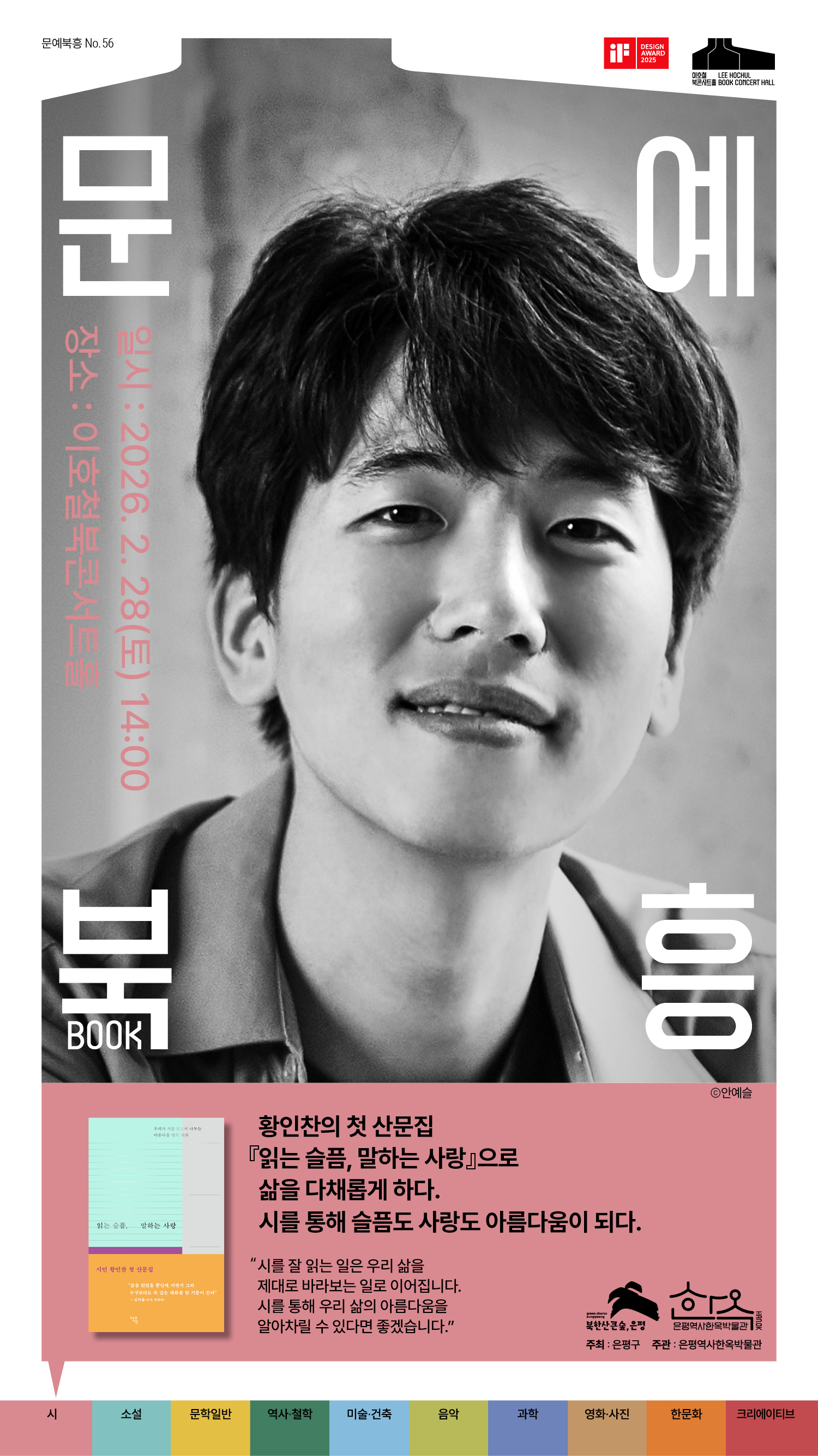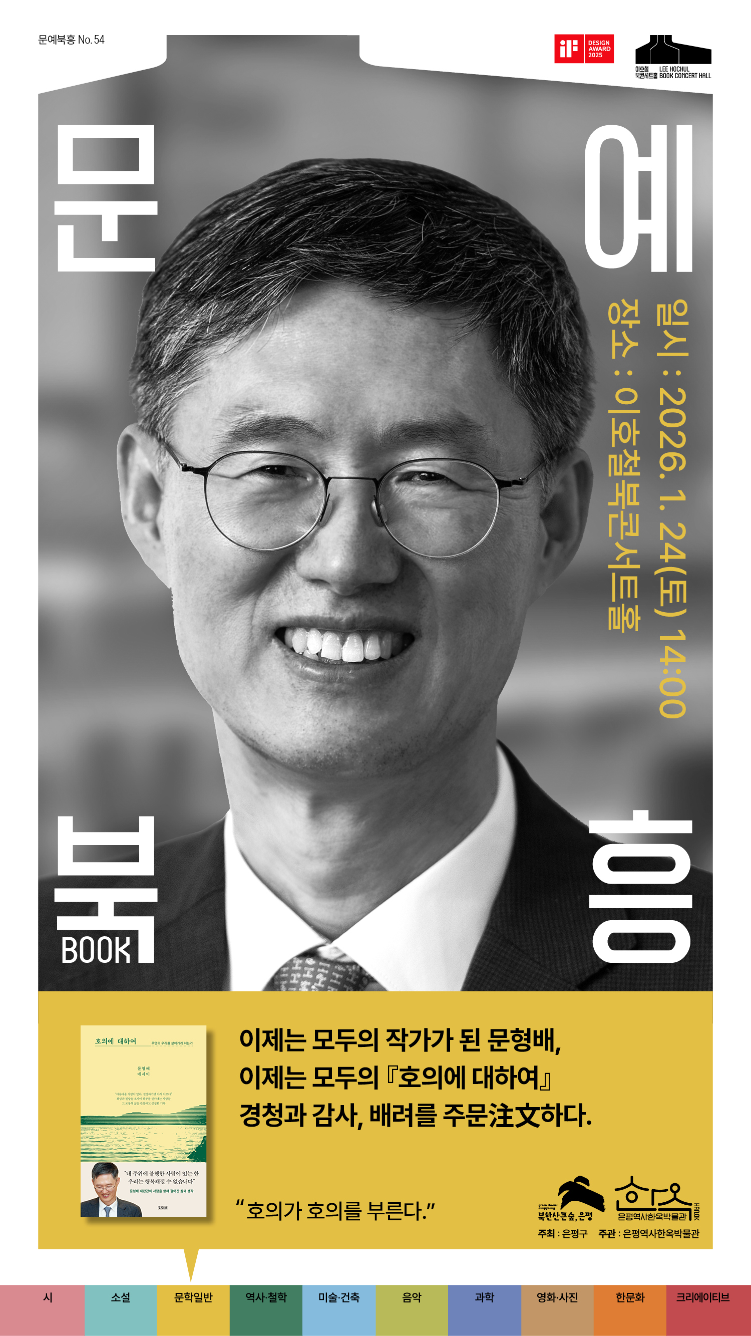 은평의 문예부흥을 염원하는 문예북흥 프로그램을 2026년 1월부터 매월 둘째주, 넷째주 토요일에 운영합니다. ※ 12월 30일 부터 2026년 1월, 2월 전체 강연 신청가능 문예북흥 No.53 - 소설가 황석영「할매」 일시 : 2026. 1. 10.(토) 14:00 * 신청 마감되었습니다. 문예북흥 No.54 - 문형배 재판관 「호의에 대하여」 일시 : 2026. 1. 24.(토) 14:00 * 신청 마감되었습니다. 문예북흥 No.55 - 시인 황유원「일요일의 예술가」 일시 : 2026. 2. 14.(토) 14:00 신청하기 문예북흥 No.56 - 시인 황인찬「읽는 슬픔, 말하는 사랑」 일시 : 2026. 2. 28.(토) 14:00 신청하기 ○ 장소 : 이호철북콘서트홀 (LBCH) 서울 은평구 통일로 767 호반베르디움스테이원 상가 2층 ○ 대상 : 누구나 (선착순 120명) ○ 참가비 : 5,000원 ○신청방법 : 이호철북콘서트홀 홈페이지 예약 / 현장신청