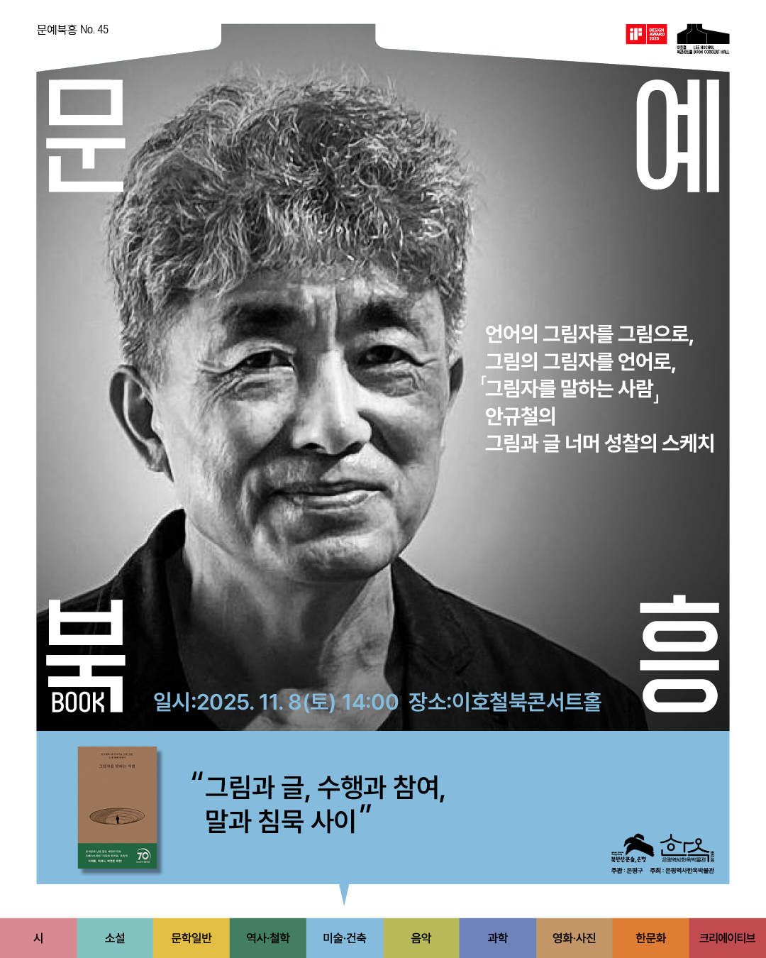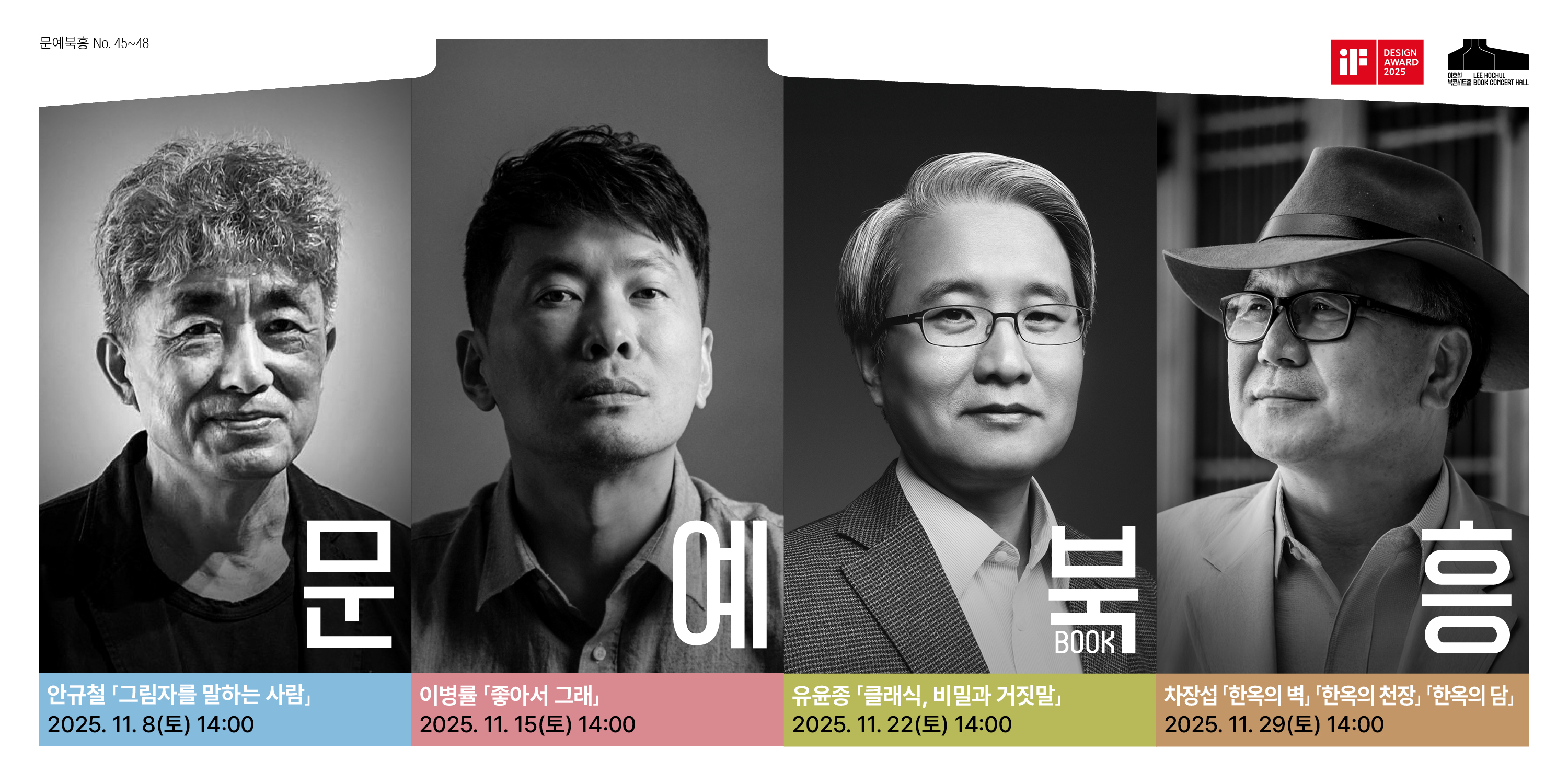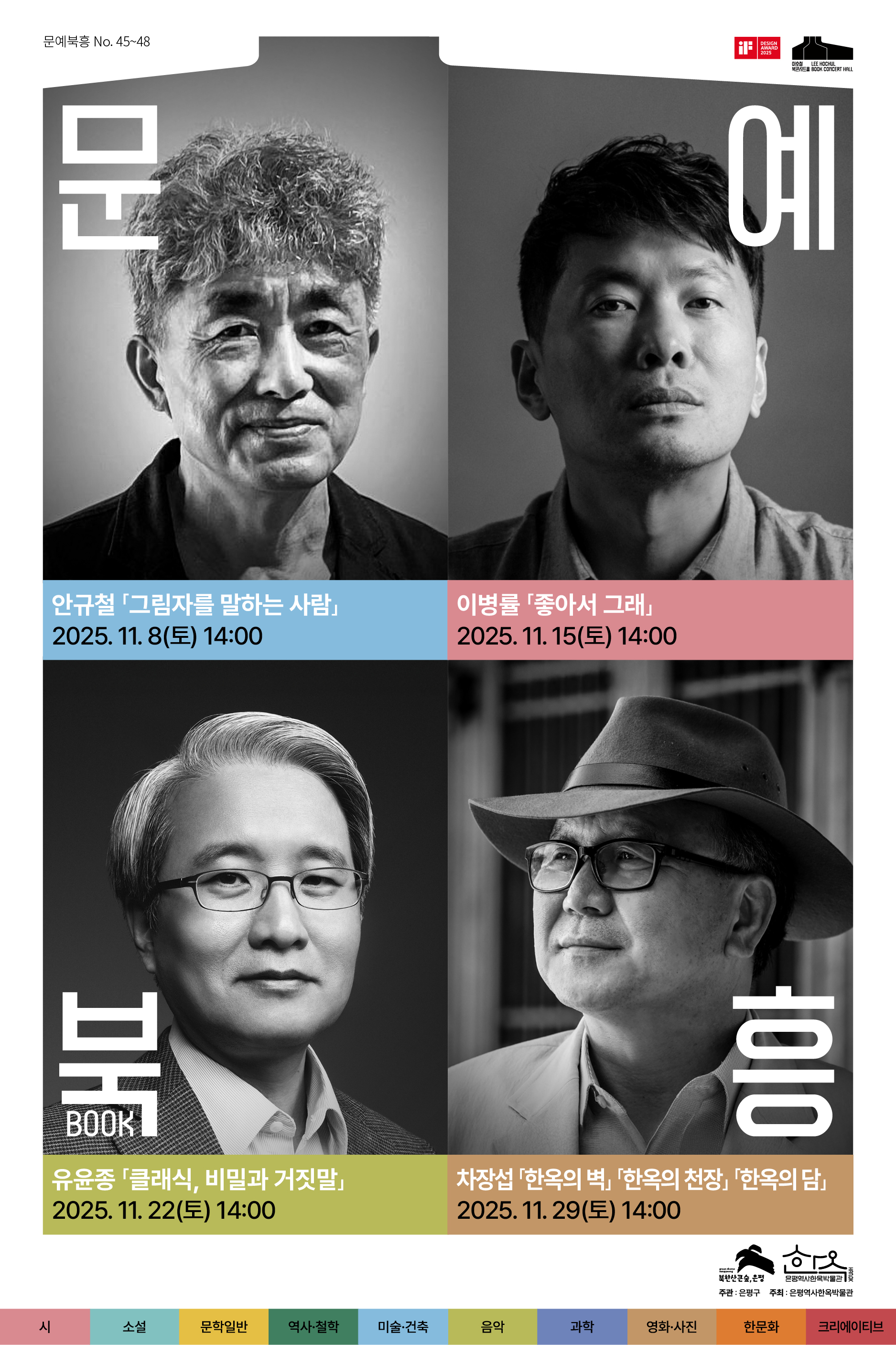 2025.10.28.은평의 문예부흥을 염원하는 문예북흥 프로그램을 2024년 11월부터 매주 토요일 52주간 운영합니다. ※ 9월 23일 부터 10월 전체 강연 신청가능 문예북흥 No.45 - 작가 안규철 언어의 그림자를 그림으로, 그림의 그림자를 언어로, 「그림자를 말하는 사람」안규철의 그림과 글 너머 성찰의 스케치 일시 : 2025. 11. 8.(토) 14:00 신청하기 문예북흥 No.46 - 시인 이병률 길 위의 시인 이병률이 속삭인다. 「좋아서 그래」사람과 사랑과 그 사이의 예술과 외로움이, 센 강을 흐르는 시간과 인생처럼 묵혀둔 와인이. 일시 : 2025. 11. 15.(토) 14:00 신청하기 문예북흥 No.47 -기자 유윤종 클래식 백과사전 유윤종이 들려주는 「클래식, 비밀과 거짓말」그 은밀한 음악사 이야기. 일시 : 2025. 11. 22.(토) 14:00 신청하기 문예북흥 No.48 - 작가 차장섭 역사학자. 사진작가 차장섭에게 「한옥의 벽」은 면, 「한옥의 천장」은 선, 「한옥의 담」은 점. 기하학의 구성요소이며 시각예술의 기본 조형 요서, 점.선.면의 총아- 한옥이다. 일시 : 2025. 11. 29.(토) 14:00 신청하기 ○ 장소 : 이호철북콘서트홀 (LBCH) 서울 은평구 통일로 767 호반베르디움스테이원 상가 2층 ○ 대상 : 누구나 (선착순 120명) ○ 참가비 : 5,000원 ○신청방법 : 이호철북콘서트홀 홈페이지 예약 / 현장신청