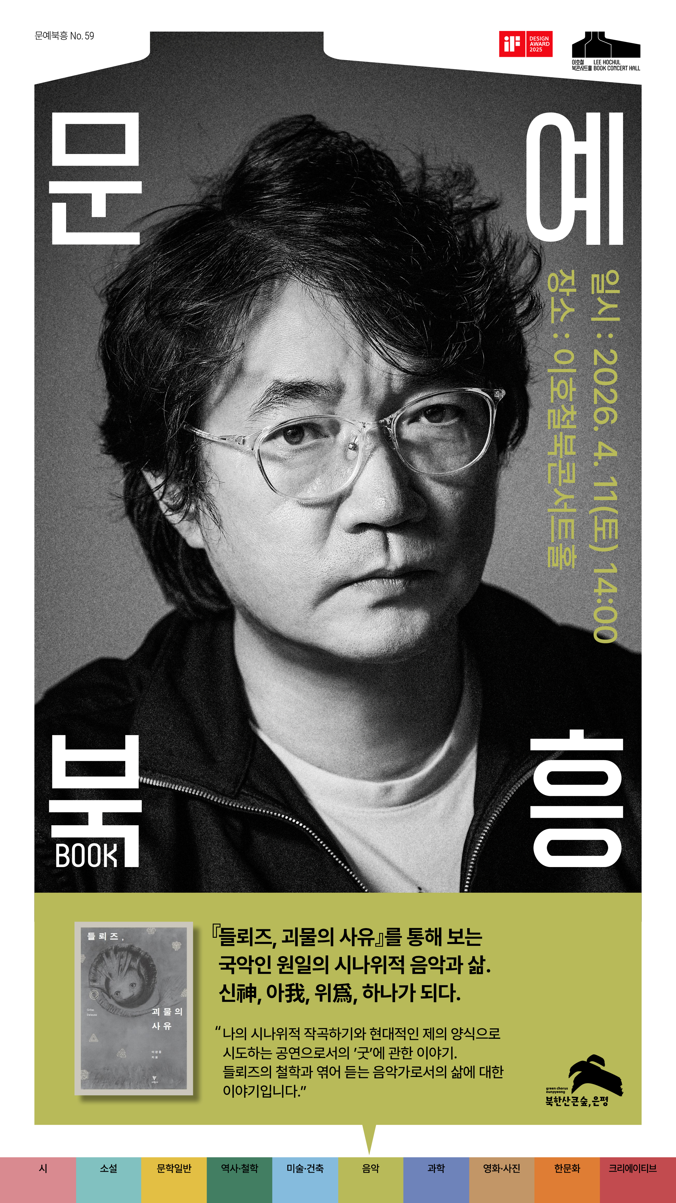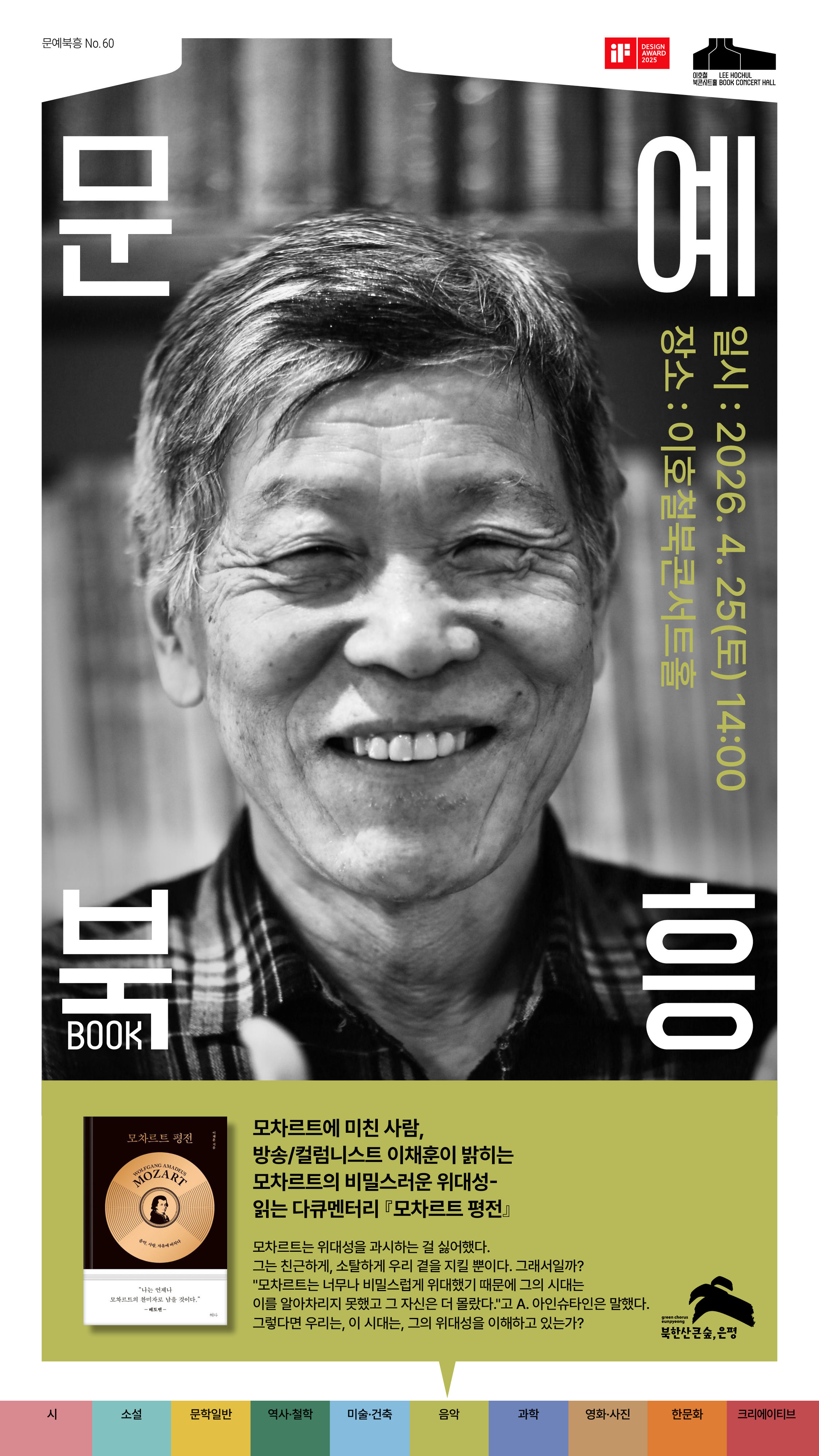 2025.12.31.은평의 문예부흥을 염원하는 문예북흥 프로그램을 2026년 1월부터 매월 둘째주, 넷째주 토요일에 운영합니다. 문예북흥 No.57 - 소설가 윤성희「느리게 가는 마음」 일시 : 2026. 3. 14.(토) 14:00 신청하기 문예북흥 No.58 - 작가 김중혁 「미묘한 메모의 묘미」 일시 : 2026. 3. 28.(토) 14:00 신청하기 문예북흥 No.59 - 작곡가 원일「들뢰즈, 괴물의 사유」 일시 : 2026. 4. 11.(토) 14:00 신청하기 문예북흥 No.60 - 음악평론가 이채훈「모차르트 평전」 일시 : 2026. 4. 25.(토) 14:00 신청하기 ○ 장소 : 이호철북콘서트홀 (LBCH) 서울 은평구 통일로 767 호반베르디움스테이원 상가 2층 ○ 대상 : 누구나 (선착순 120명) ○ 참가비 : 5,000원 ○신청방법 : 이호철북콘서트홀 홈페이지 예약 / 현장신청