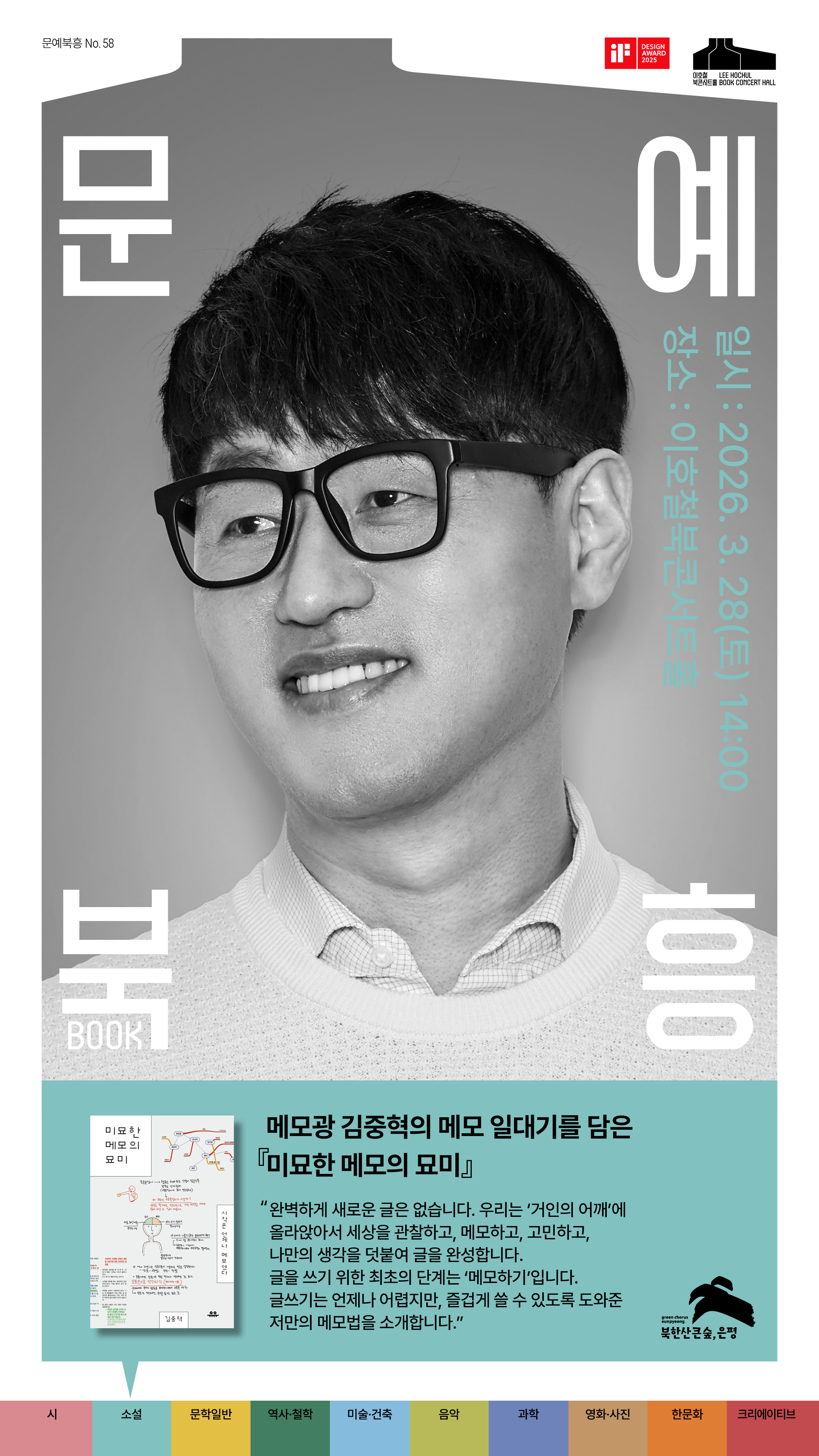 2025.12.31.은평의 문예부흥을 염원하는 문예북흥 프로그램을 2026년 1월부터 매월 둘째주, 넷째주 토요일에 운영합니다. ※ 12월 30일 부터 2026년 1월, 2월 전체 강연 신청가능 문예북흥 No.57 - 소설가 윤성희「느리게 가는 마음」 일시 : 2026. 3. 14.(토) 14:00 신청하기 문예북흥 No.58 - 작가 김중혁 「미묘한 메모의 묘미」 일시 : 2026. 3. 28.(토) 14:00 * 신청 페이지 작업중 문예북흥 No.59 - 작곡가 원일「들뢰즈, 괴물의 사유」 일시 : 2026. 4. 11.(토) 14:00 * 신청 페이지 작업중 문예북흥 No.60 - 음악평론가 원일「모차르트 평전」 일시 : 2026. 4. 25.(토) 14:00 * 신청 페이지 작업중 ○ 장소 : 이호철북콘서트홀 (LBCH) 서울 은평구 통일로 767 호반베르디움스테이원 상가 2층 ○ 대상 : 누구나 (선착순 120명) ○ 참가비 : 5,000원 ○신청방법 : 이호철북콘서트홀 홈페이지 예약 / 현장신청